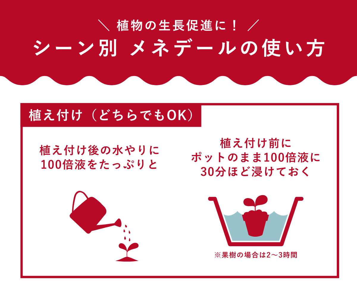 「メネデール」は、植物の根の活着(根づき)を助ける植物活力素です。