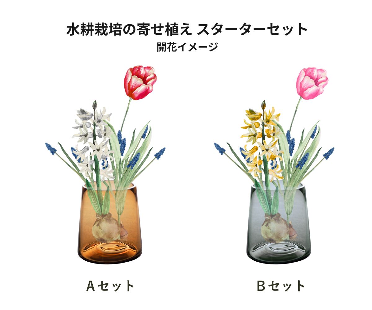球根の水耕栽培を最大限に楽しめるおしゃれなガラスベースをセットでお届け。