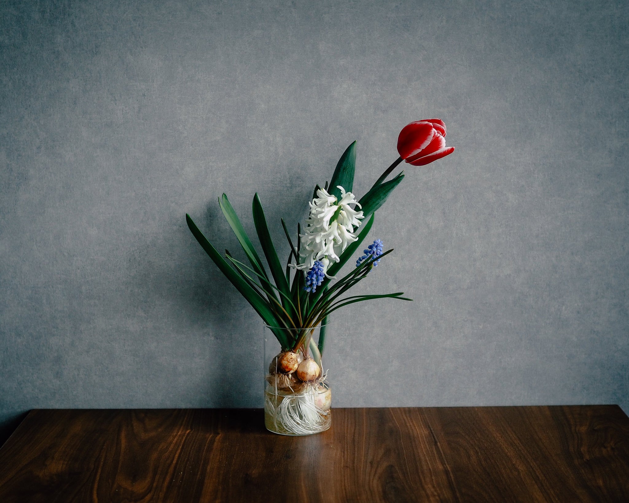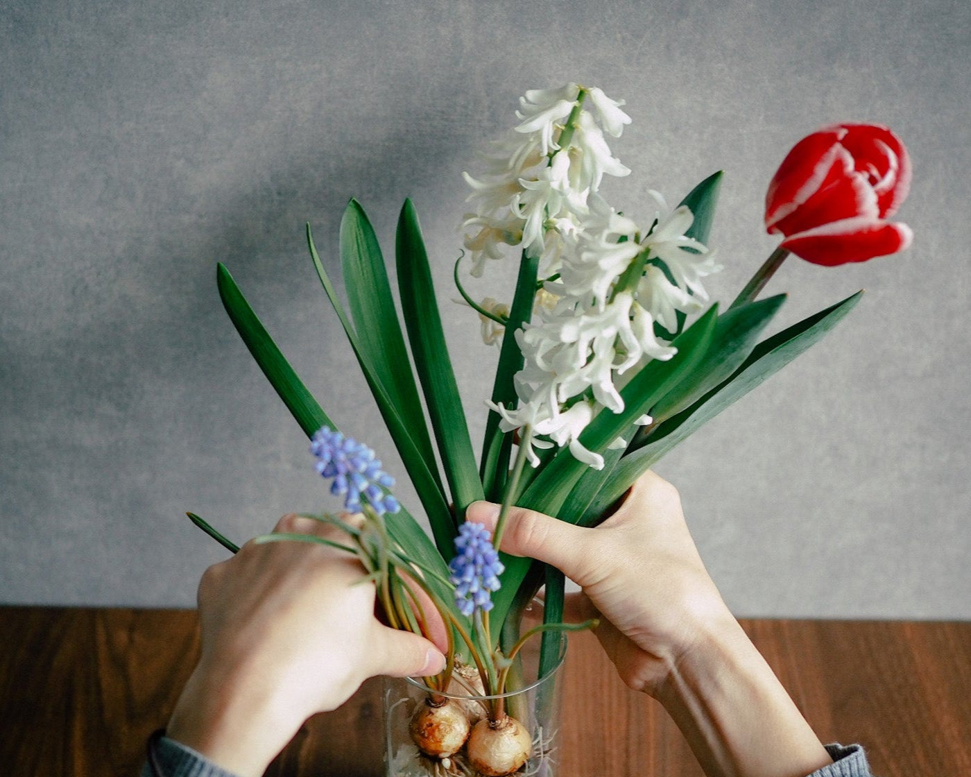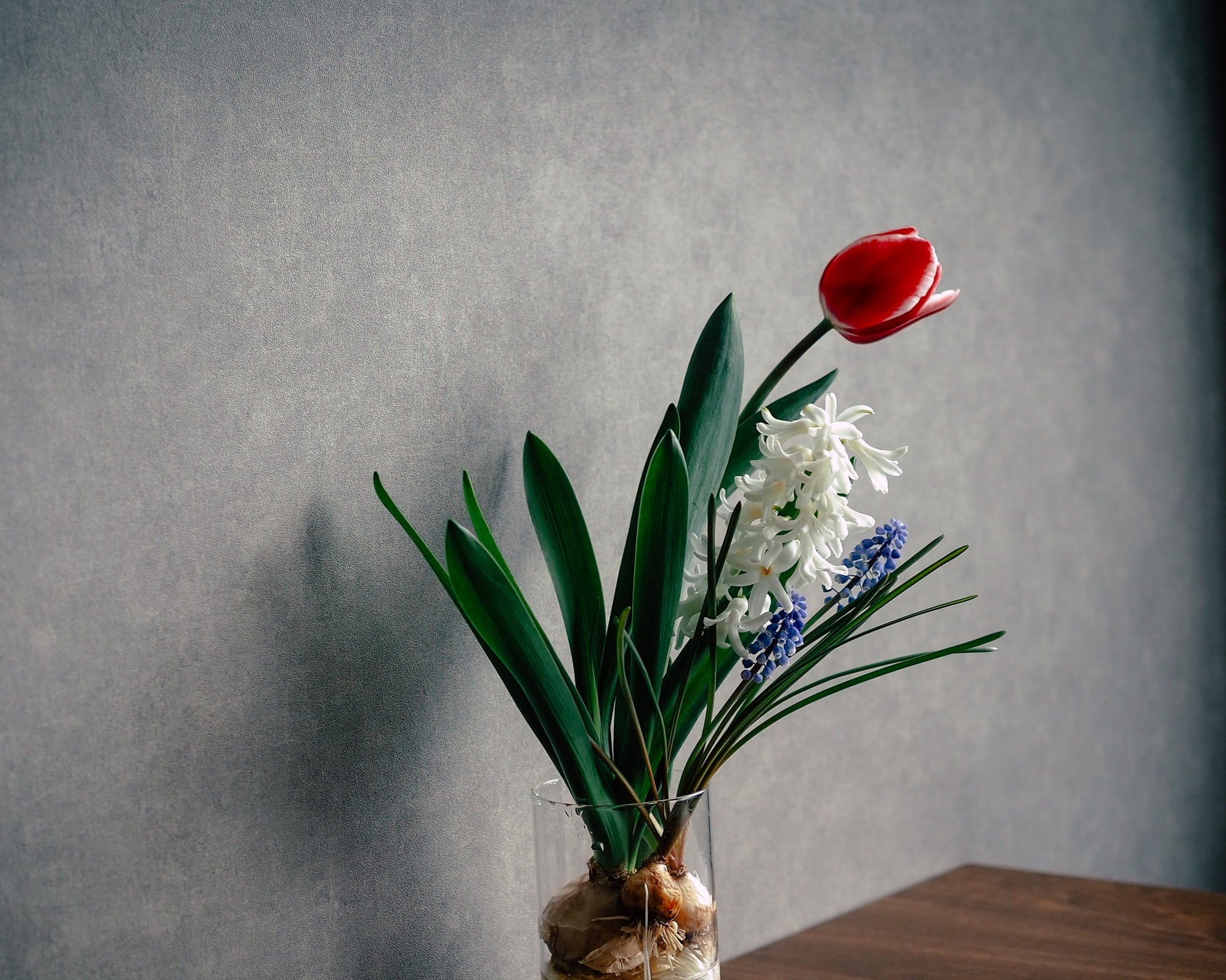 寄せ植えにすると、ヒヤシンスやチューリップとのバランスが絶妙で、水耕栽培でもコンパクトに育てやすいのが魅力です。